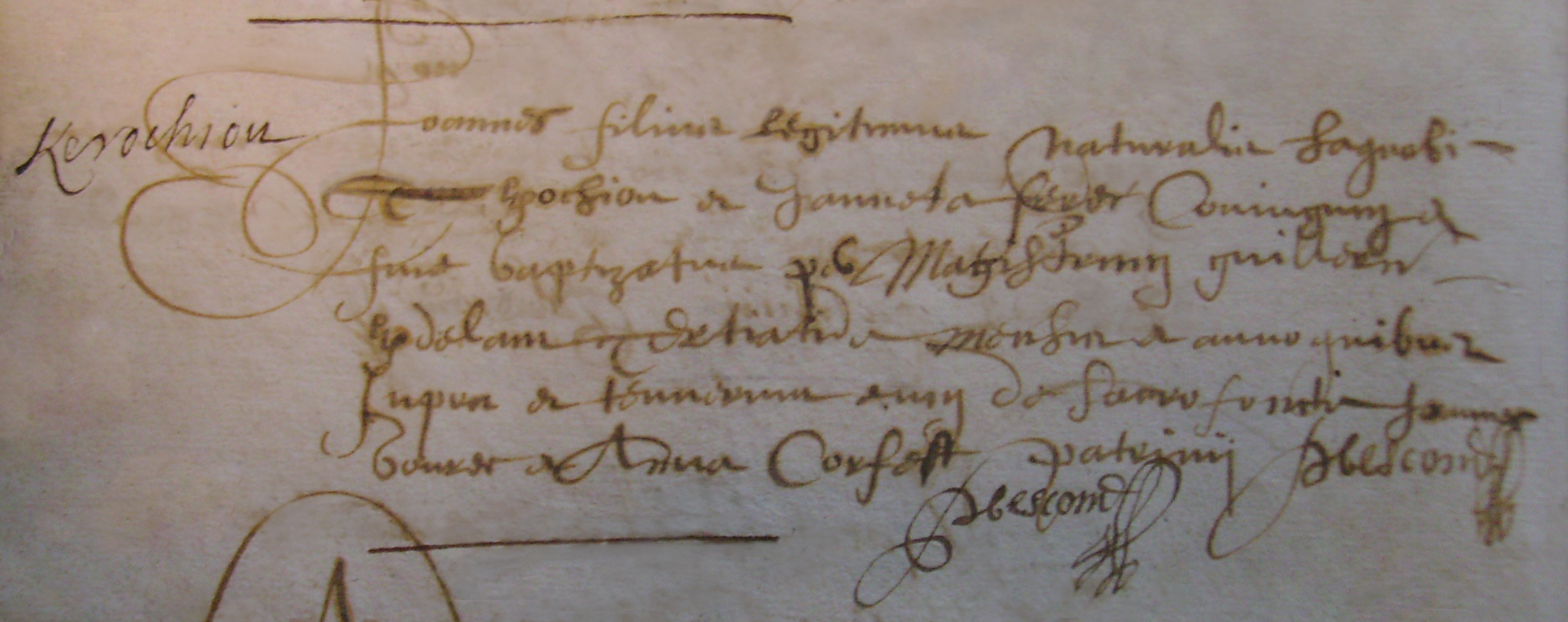 Joannes filius legitimus naturalis Jaquobus Keroc'hiou et Janneta Ferec coniugum et fuit baptizatus per Magisterium Guilloen ..ydolam et tertiati mensis et anno quibus supra et tennorum ... de sacro fontis Joannes Gourec et Anna Corfest patrinii. Bescond. Bescond |